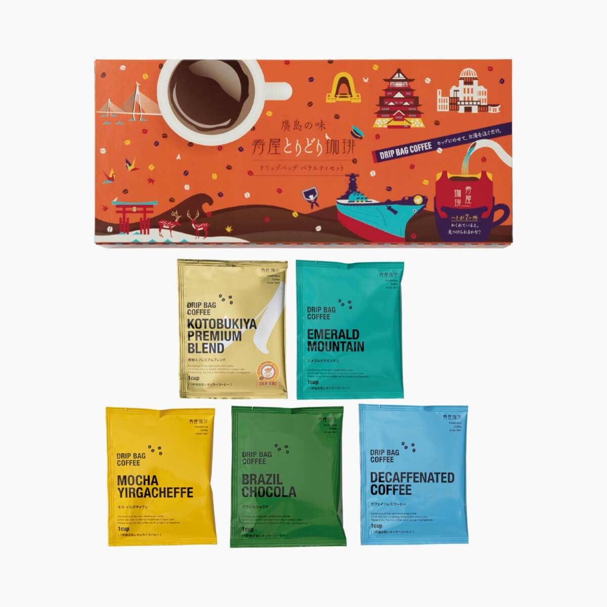 広島の老舗、寿屋珈琲。2014年の国際カフェテイスティング競技会にて金賞を受賞した「寿屋Aプレミアムブレンド」をはじめ、こだわりの詰まった全5種類がセットになっています。