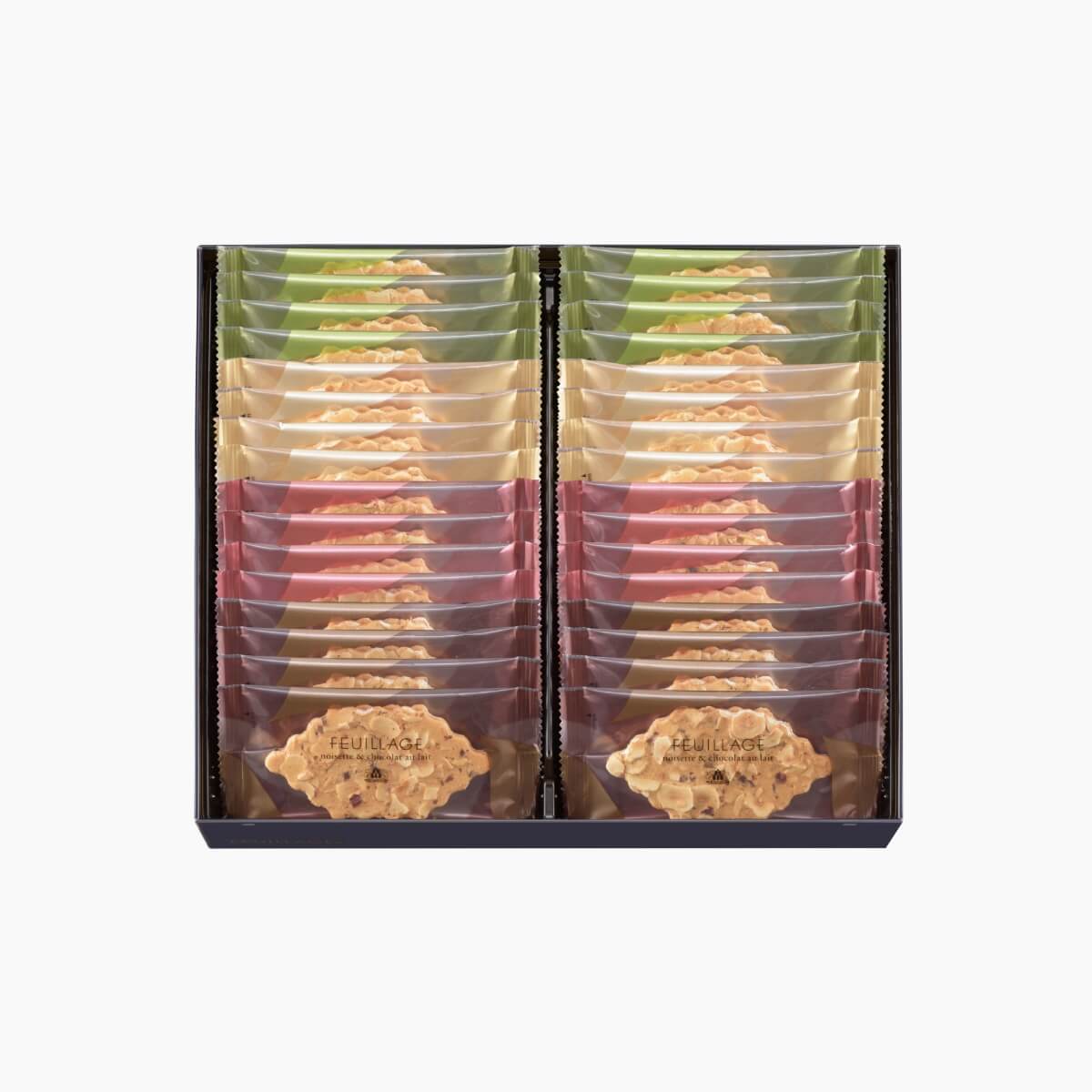 スライスナッツを敷き詰めたクッキーに、ナッツに合わせて厳選された相性の良いチョコレートがサンドされています。葉のモチーフは一般的に「希望」「成長」「信頼」などの意味もあり、出産内祝いのギフトに最適です。