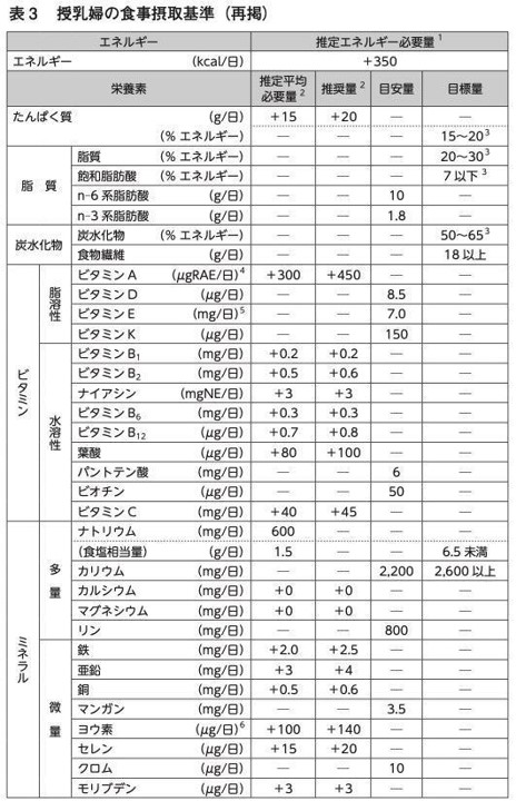 日本人の食事摂取基準(2020年版)には、授乳婦の食事摂取基準が掲載されています。