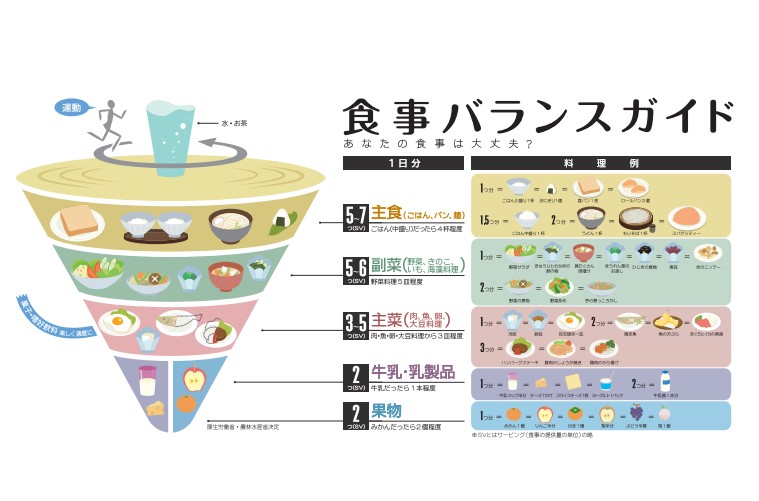 1日に「なにを」「どれだけ」食べたらよいかわからない方は、厚生労働省と農林水産省が出している「食事バランスガイド」を参考にしてみてください。