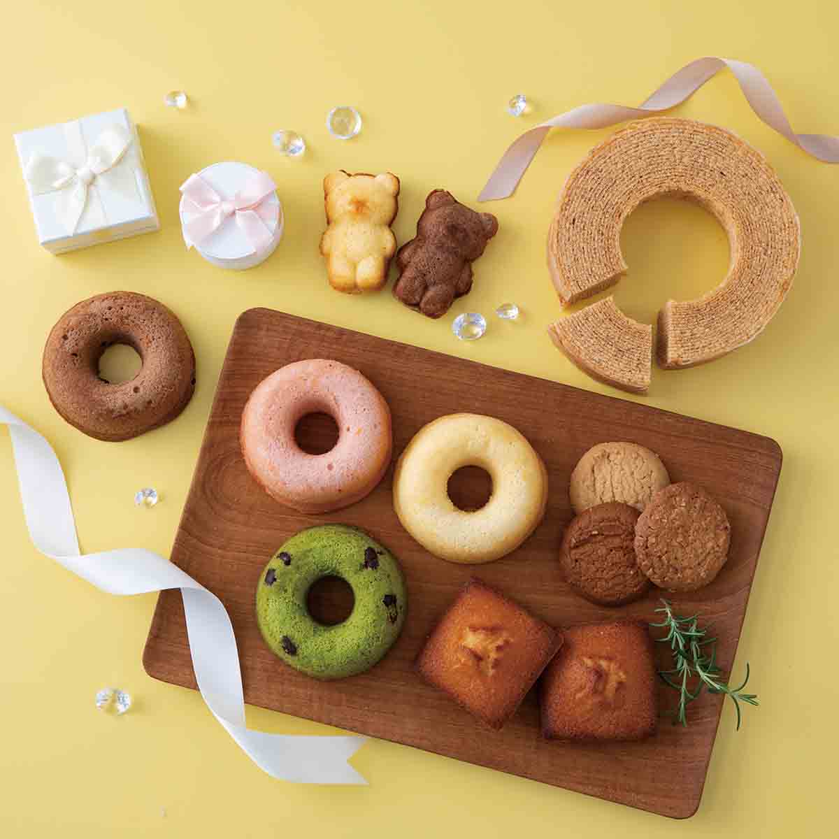 | 内容 | バウムクーヘン(カット)×1、くまマドレーヌ(プレーン×1、ココア×1)、フリアンディーズ×2、焼きドーナッツ(プレーン×1、苺×1、抹茶×1)、からす麦のクッキー×1、キャラメルクッキー×1、アーモンドクッキー×1 |