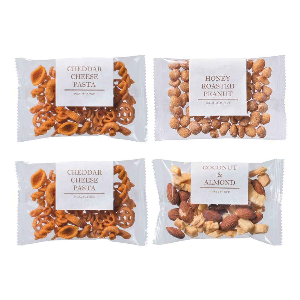 | 内容 | チェダーチーズパスタ20g×2・ココナッツアーモンド43g×1・ハニーローストピーナッツ33g×1 |